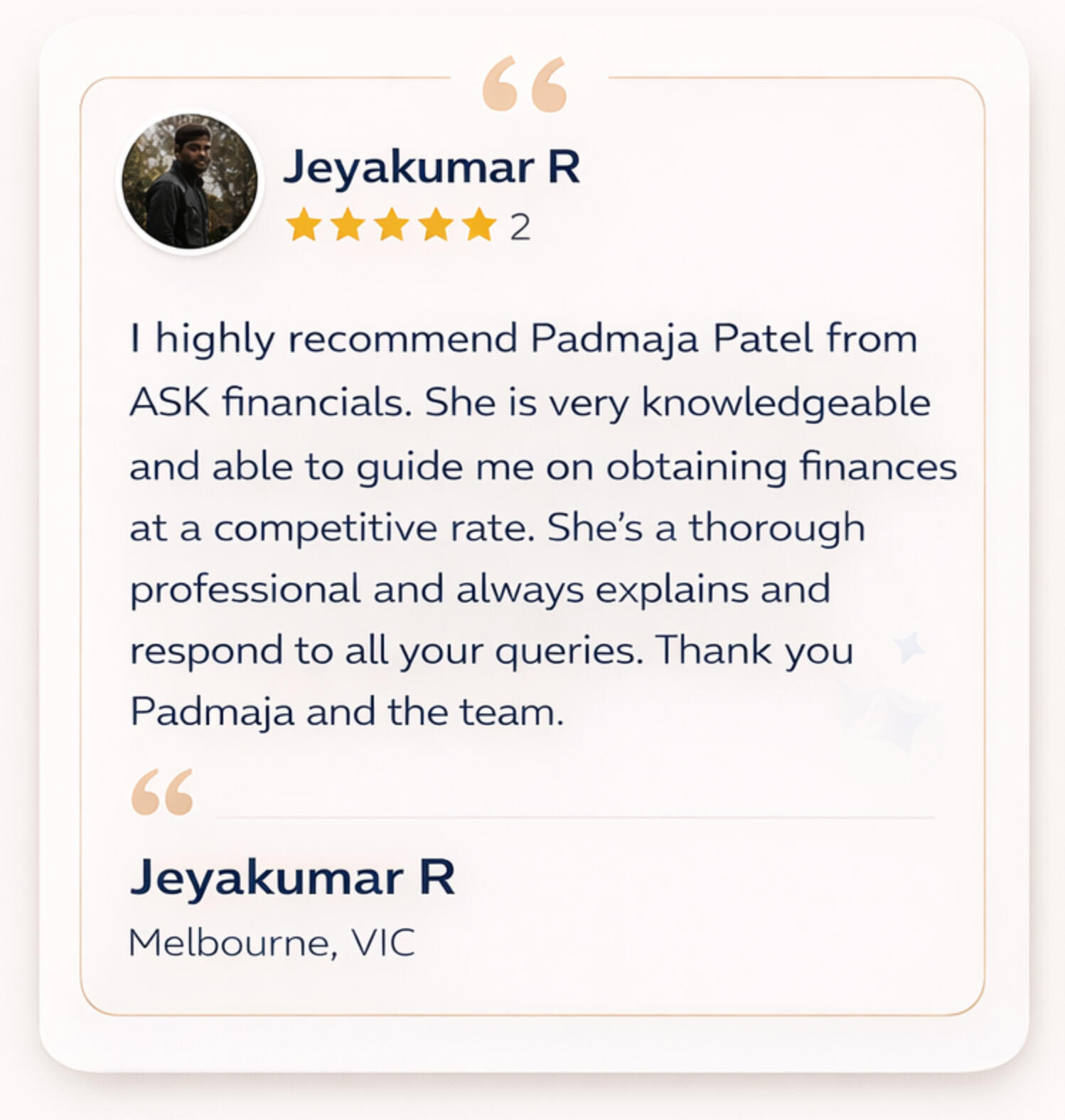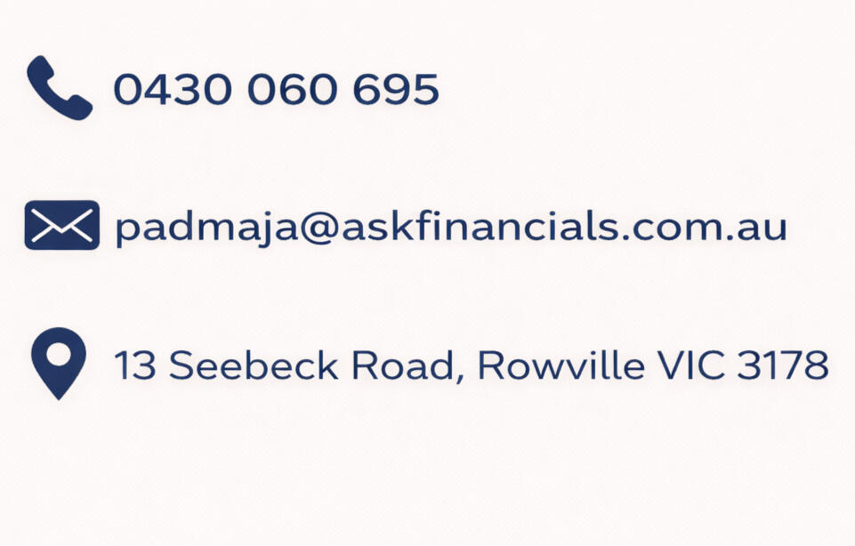 Padmaja Patel - Mortgage Brokers ABN: 17153479338. Credit Representative # 562032 is authorised under Australian Credit License #389087.Disclaimer: This page provides general information only and has been prepared without taking into account your objectives, financial situation or needs. We recommend that you consider whether it is appropriate for your circumstances and your full financial situation will need to be reviewed prior to acceptance of any offer or product. It does not constitute legal, tax or financial advice and you should always seek professional advice in relation to your individual circumstances.